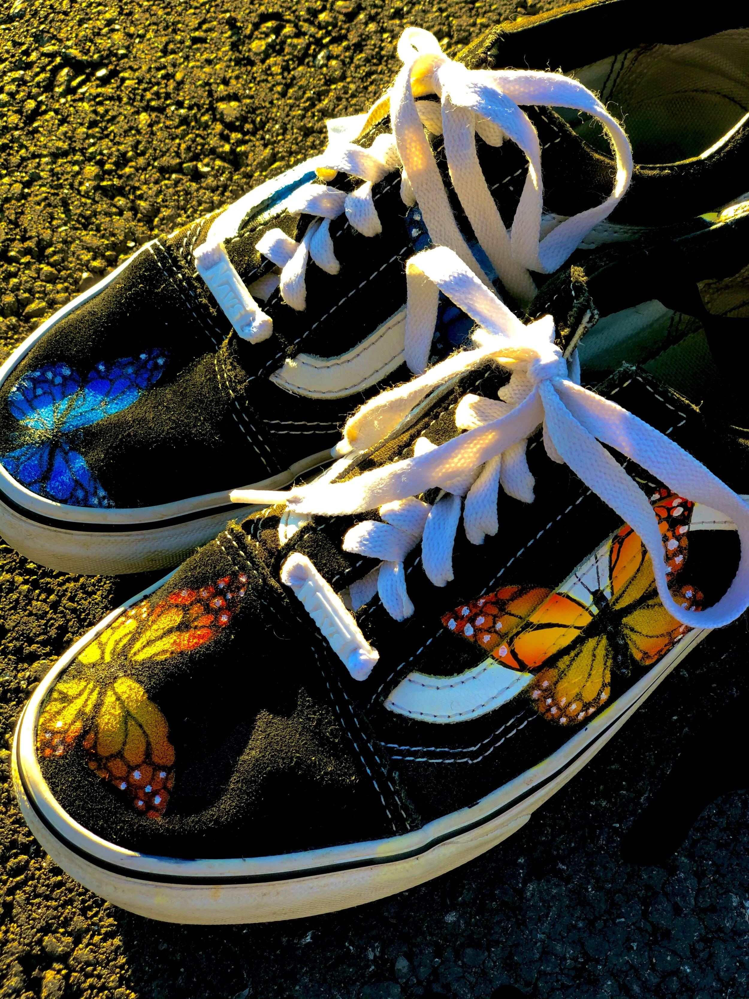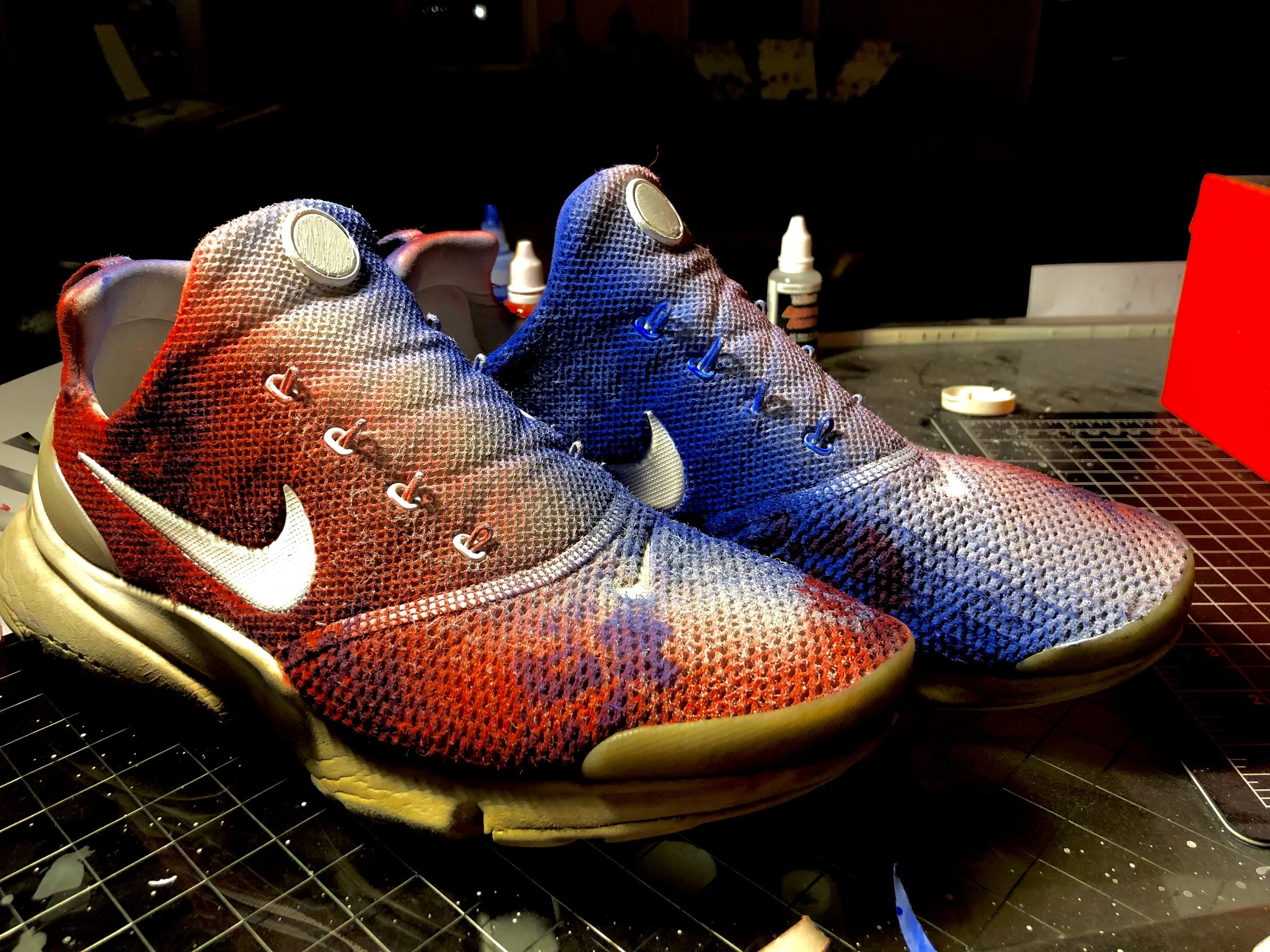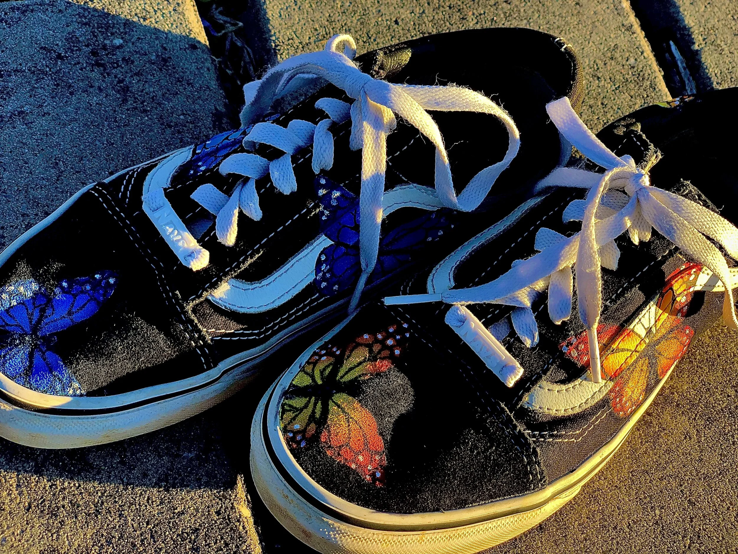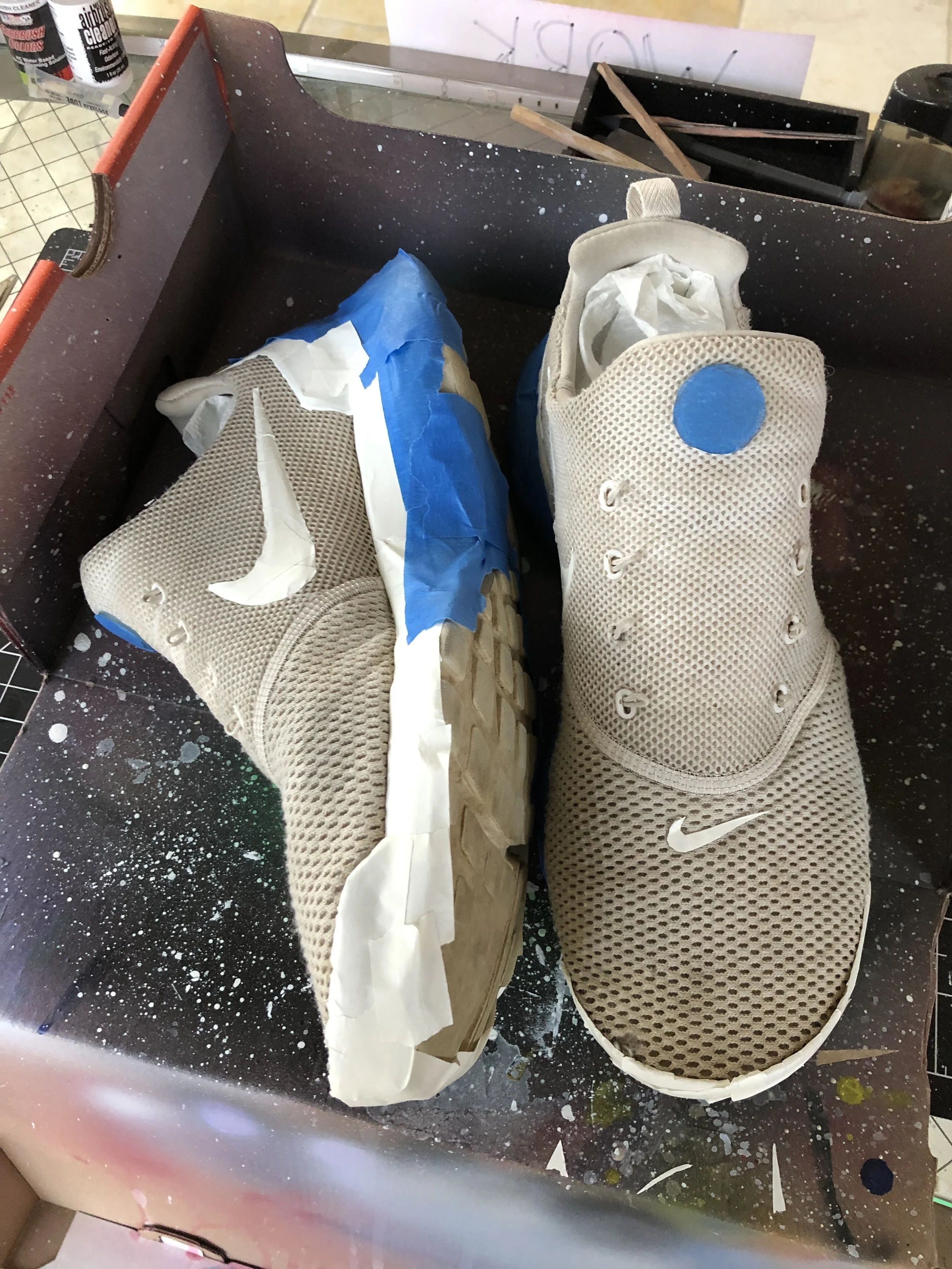Using an airbrush and handmade stencils each one of these heavily worn kicks were turned into new, one of a kind collector items.
