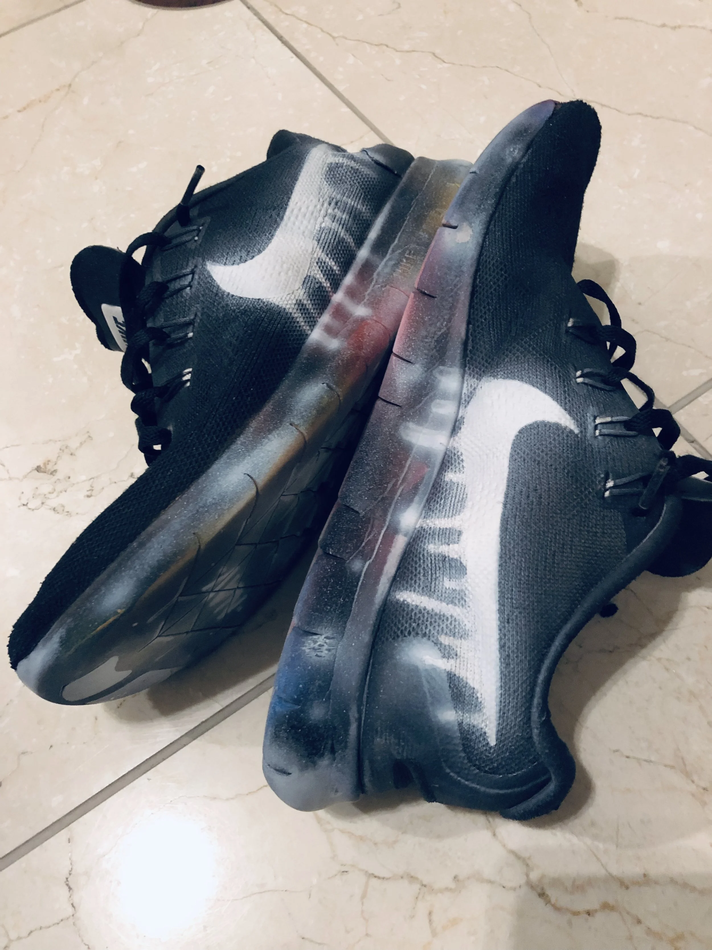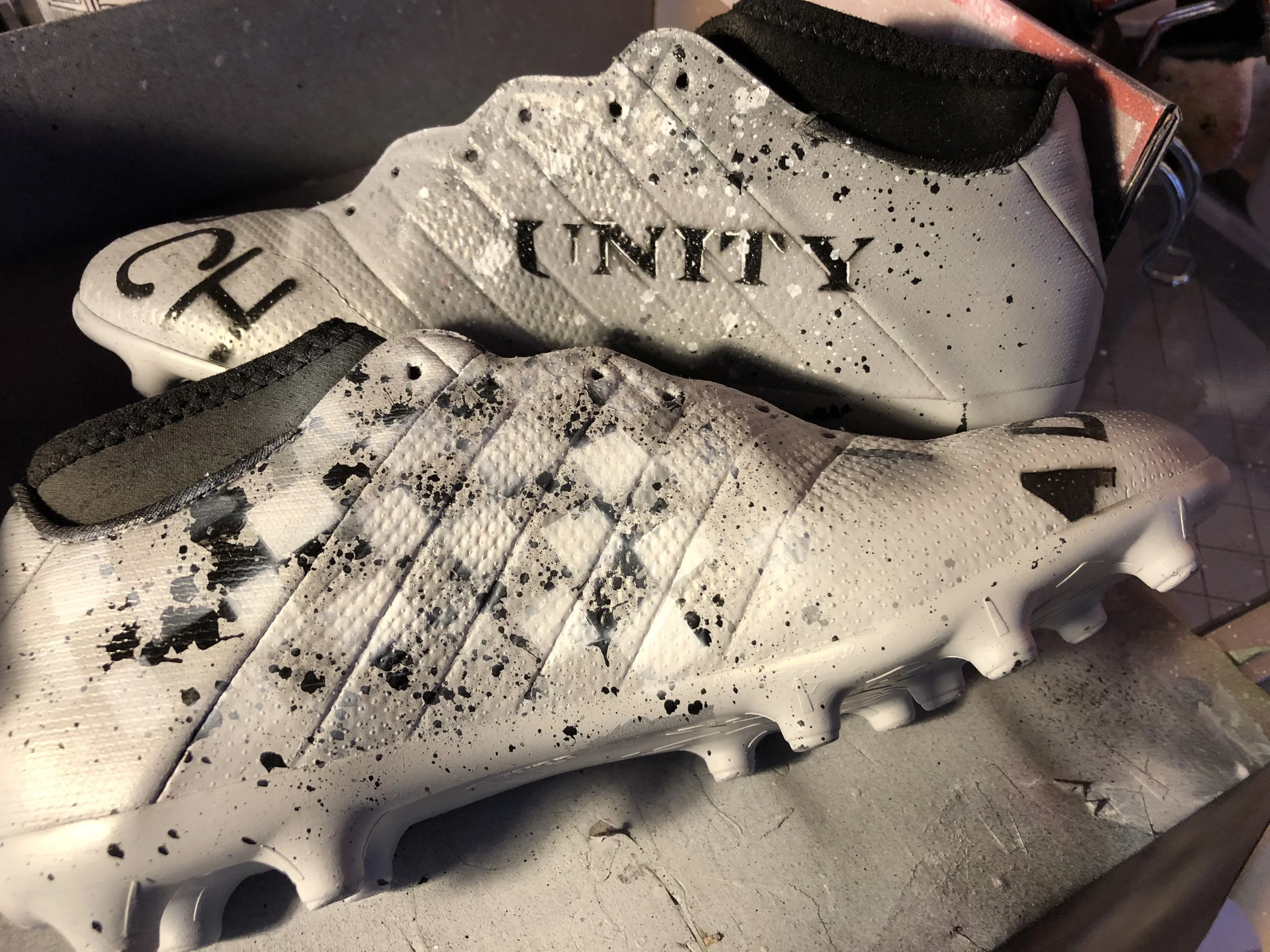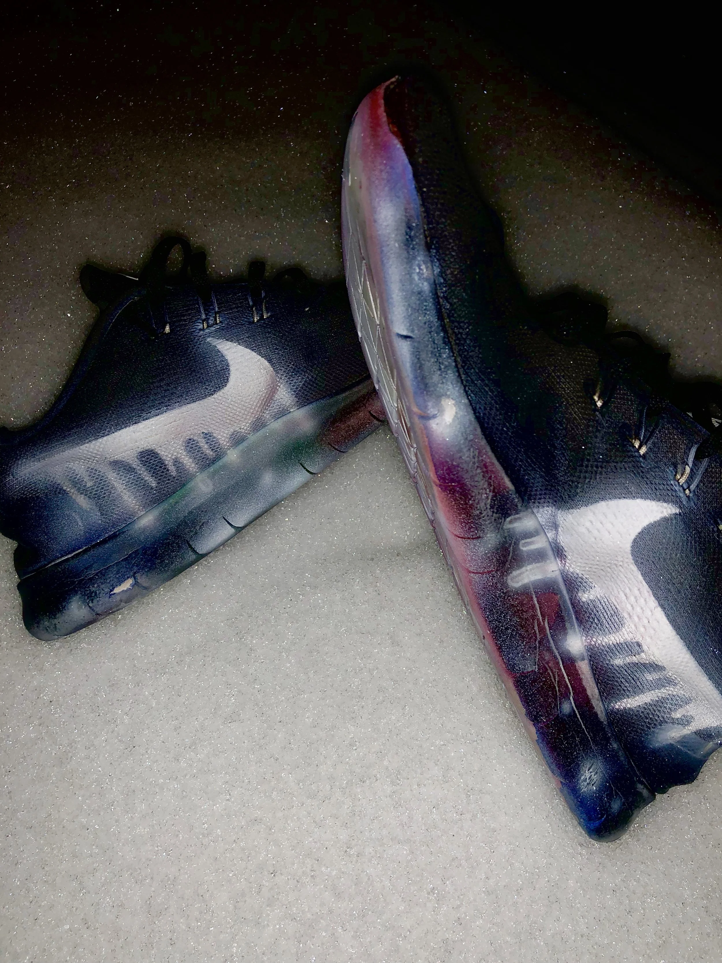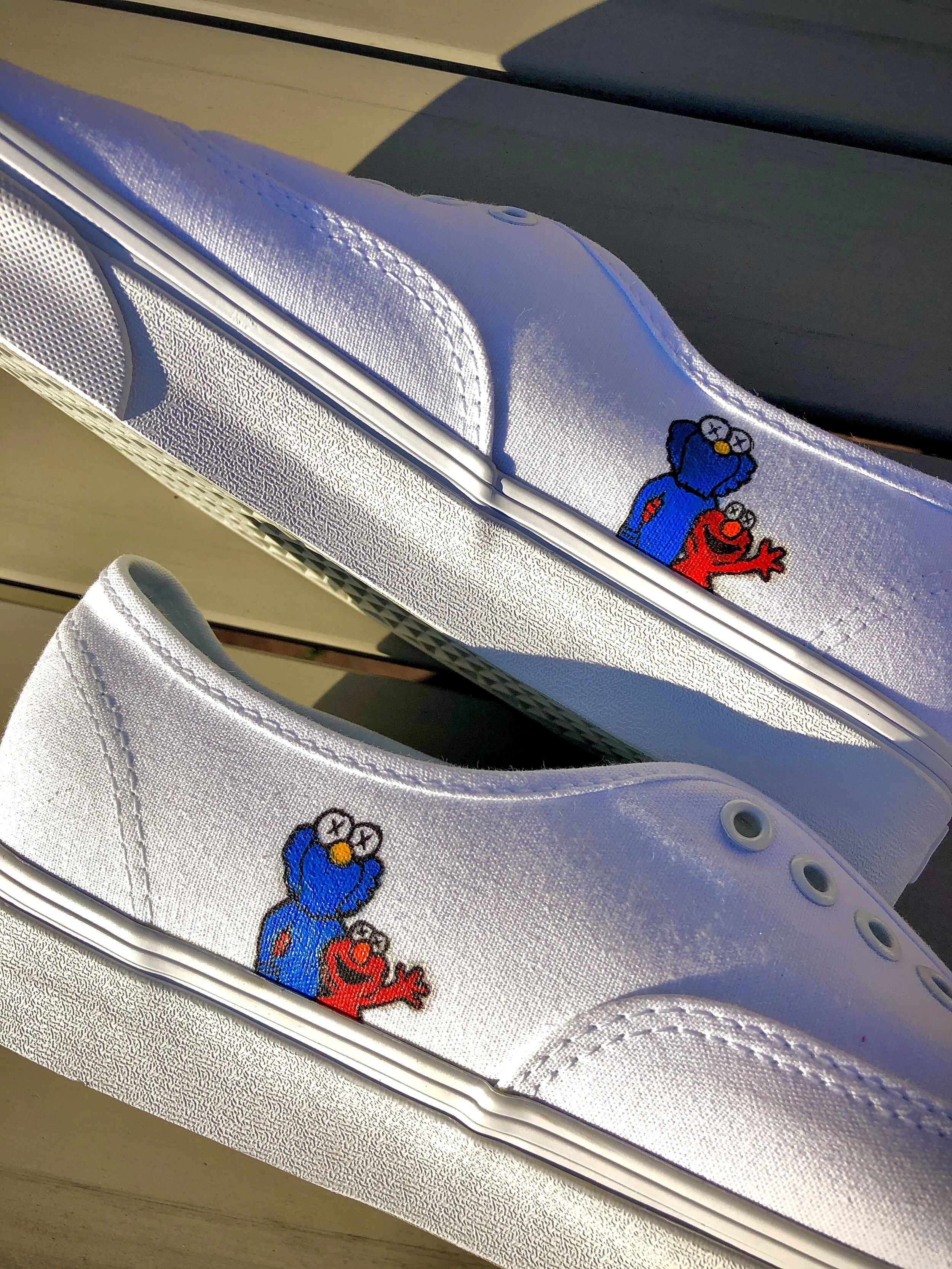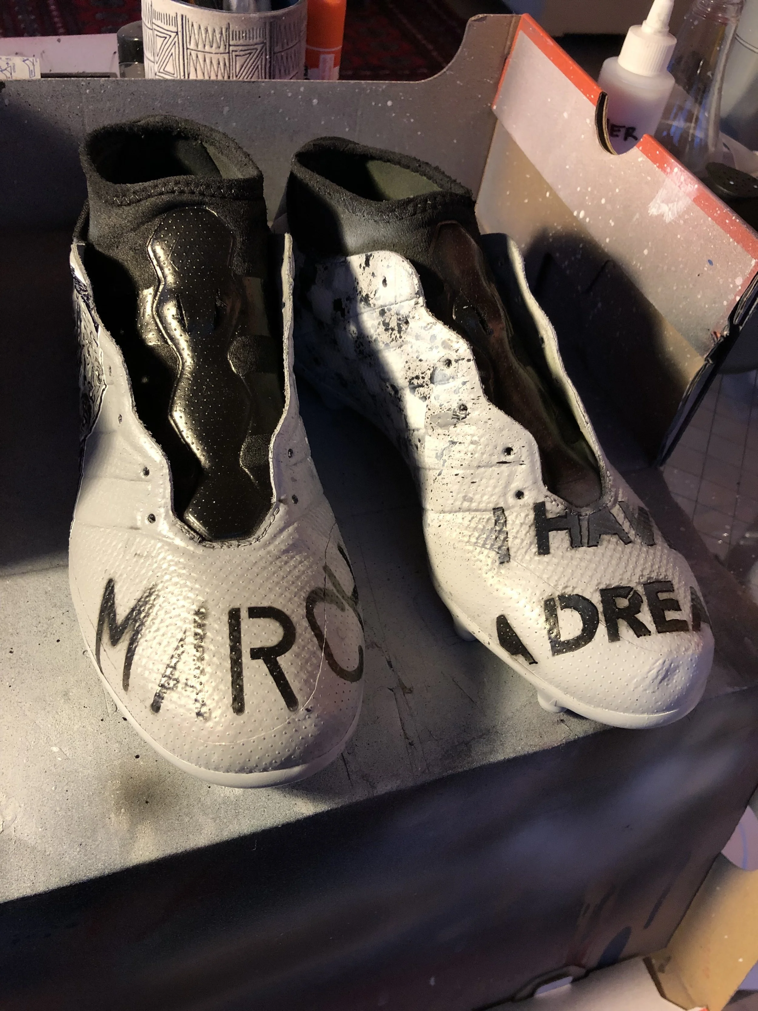 Using an airbrush and handmade stencils each one of these heavily worn kicks were turned into new, one of a kind collector items.