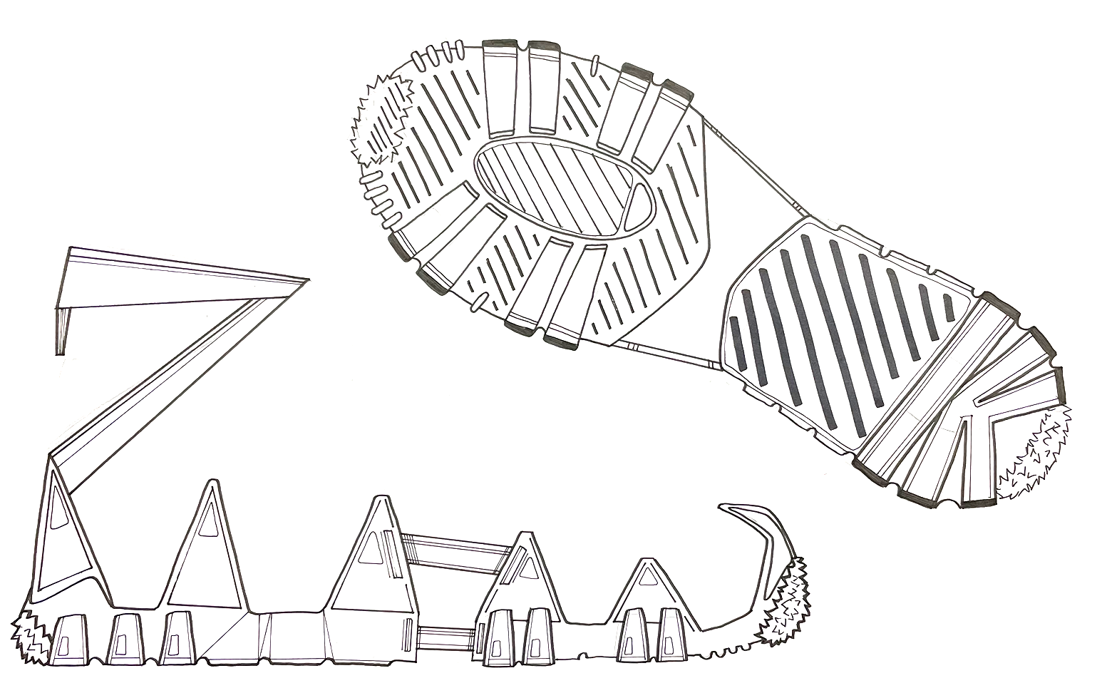 The final result ties in a rugged tread with secure upper attachment straps. The design intends to put safety as first priority: including reflective strips, steel spikes, and a natural rubber tread.